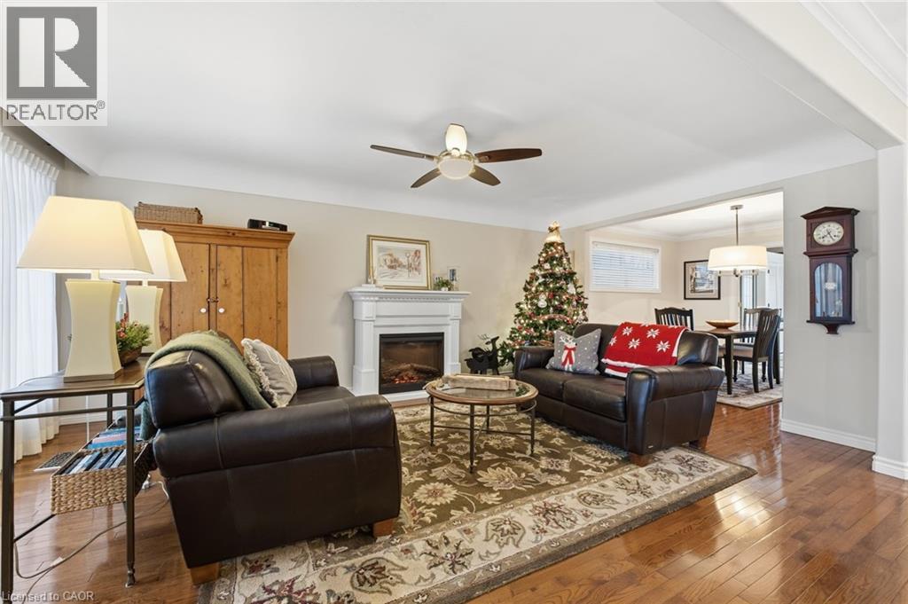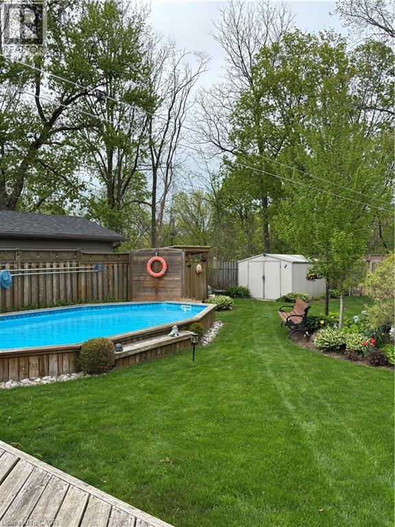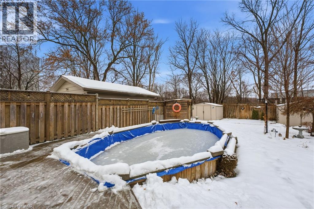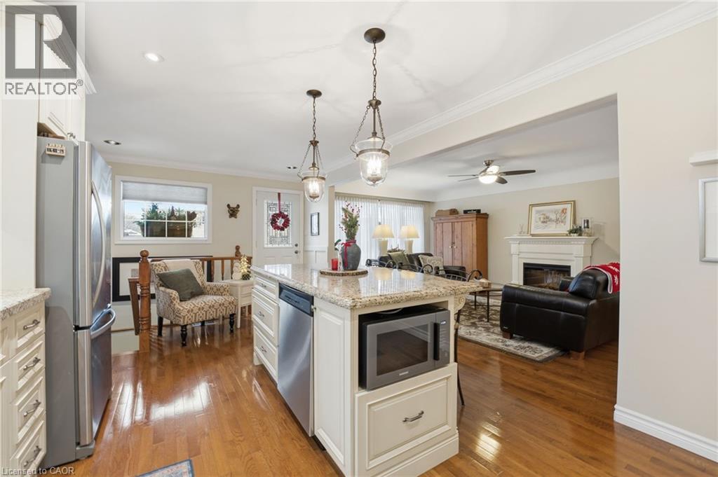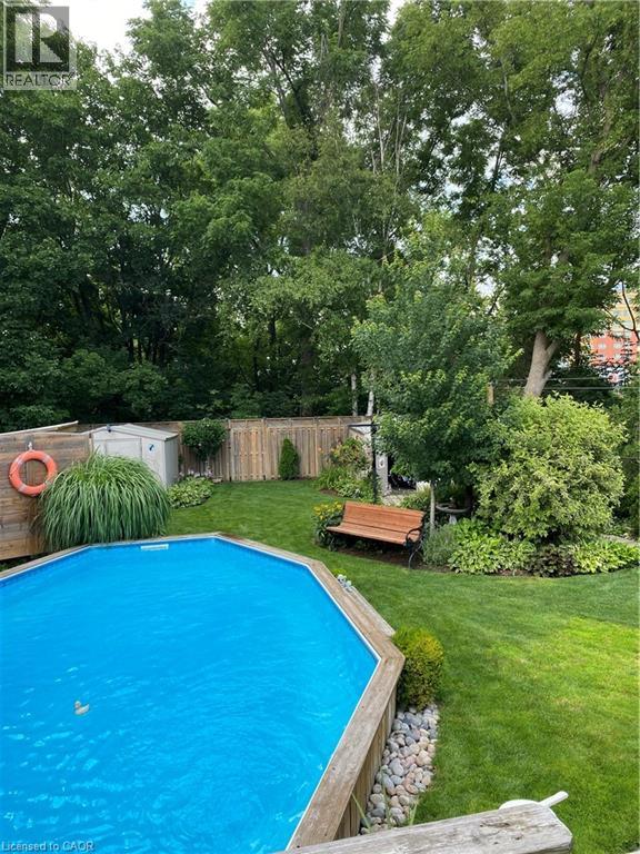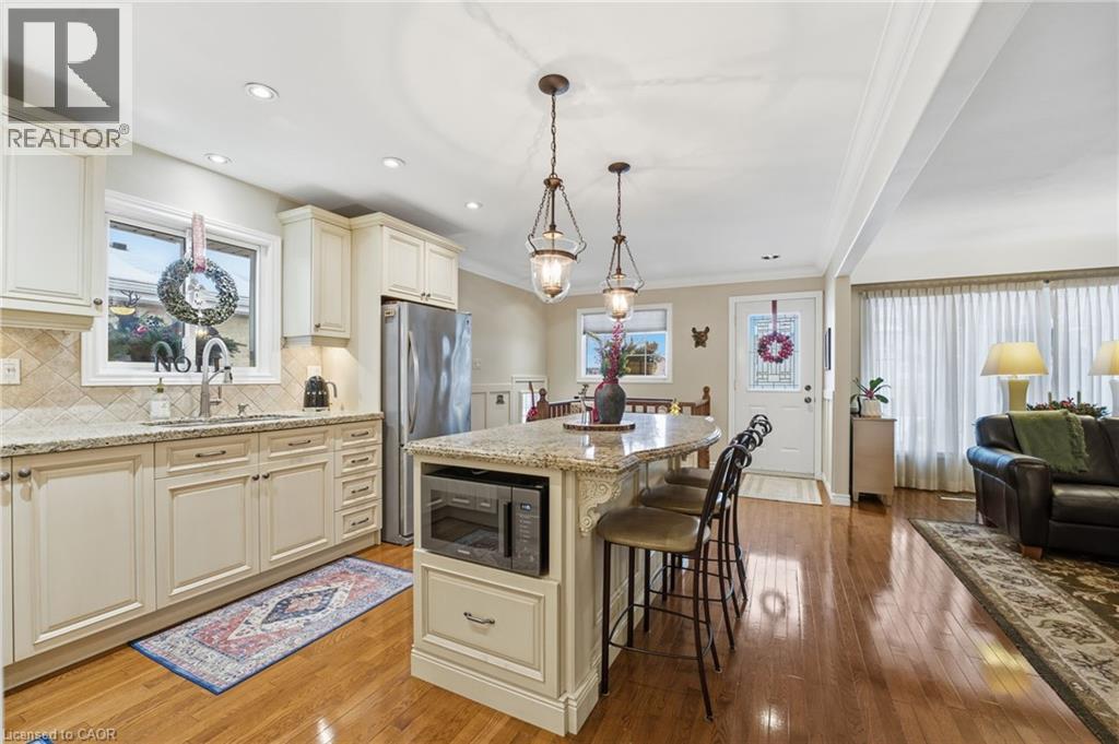 Welcome to 34 Ramsey Cres, a beautifully maintained home that blends modern upgrades with timeless charm. This beautifully maintained home offers an open-concept main floor featuring a stunning kitchen that flows seamlessly into the living and dining areas, perfect for entertaining or enjoying cozy family moments. Gleaming hardwood floors and elegant crown molding add sophistication throughout. The main level boasts two bedrooms and a stylish 4-piece bathroom, while a convenient side entrance leads to a fully finished basement complete with a third bedroom, a 3-piece bath, a warm recreation room with a Hamilton Brick hearth gas fireplace, a dry bar, laundry space, and ample storage. Step outside to an extended lot with a professionally landscaped yard, a two-tier deck with natural gas hookup for your BBQ, and a fully fenced backyard featuring an irrigation system, an above on-ground chlorine pool, and double sheds, both equipped with hydro. Backing onto serene green space with direct access to the Hamilton/Brantford Rail Trail, this property offers unmatched privacy and tranquility. Located in Hamilton’s highly desirable west end, you’ll enjoy proximity to top-rated schools, shopping, McMaster Hospital, and Downtown Hamilton. Notable Updates: Main Floor Kitchen Renovation (05’), Main Floor Electrical and 200-AMP Electrical Panel (05’), Main Floor Bathroom Renovation (12’), Roof (14’), Windows (15’), Soffit/Fascia/Eavestrough/Shaker Siding (15’), Pool Liner (15’), Exposed Aggregate Driveway and Sidewalk (18’), Front & Rear Yard Irrigation System (22’), Gas Fireplace (22’), Pool Pump and Sand Filter (23’). Don’t miss your chance to fall in love with this exceptional home! (id:30748)